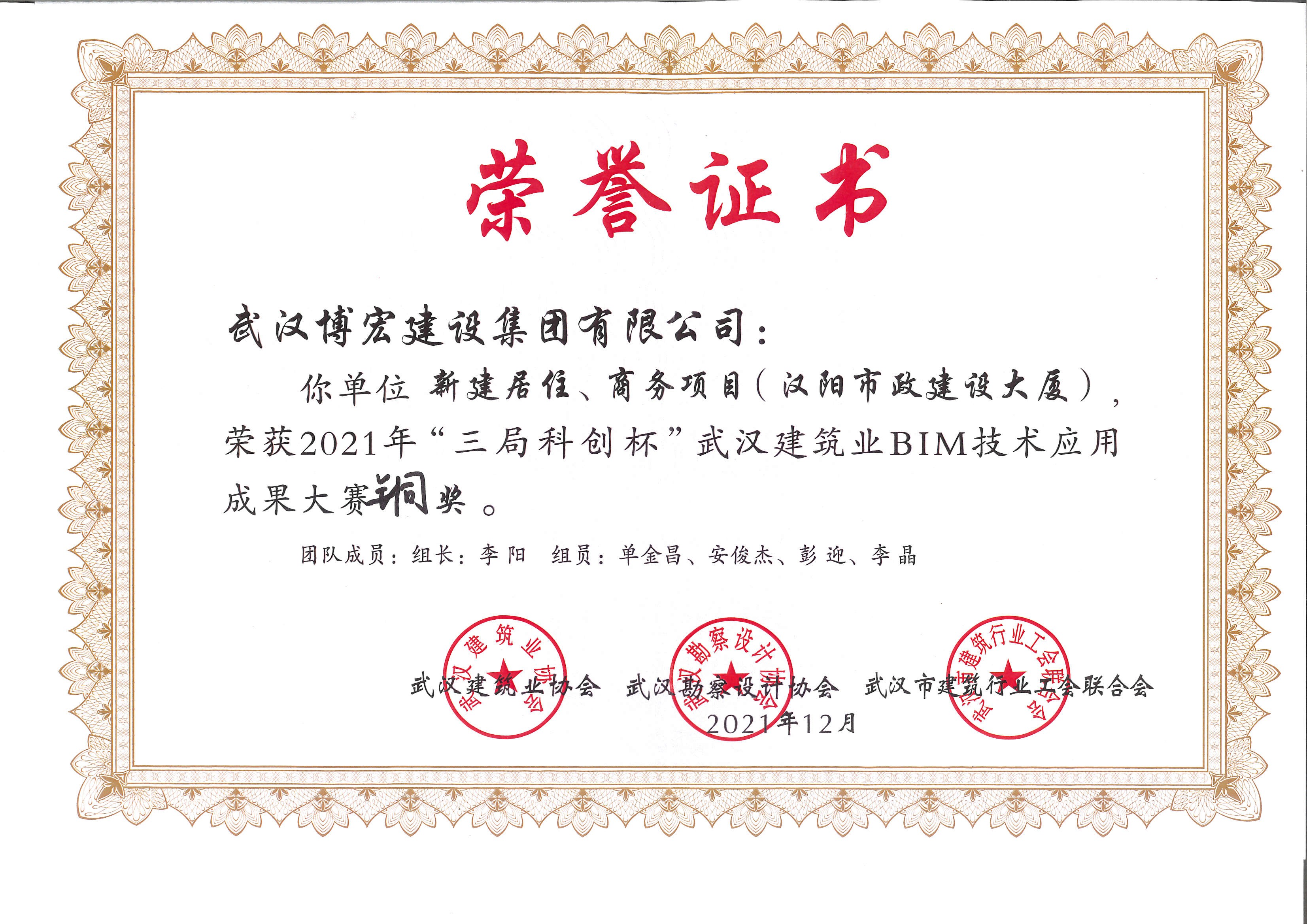漢陽市政大廈2021年“三局科創(chuàng)杯”武漢建筑業(yè)BIM技術(shù)應(yīng)用成果大賽銅獎(jiǎng)